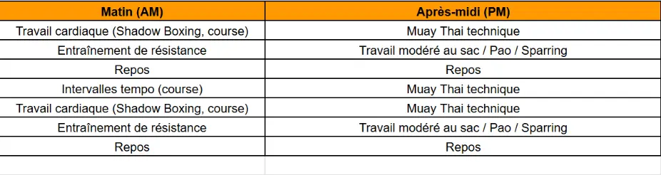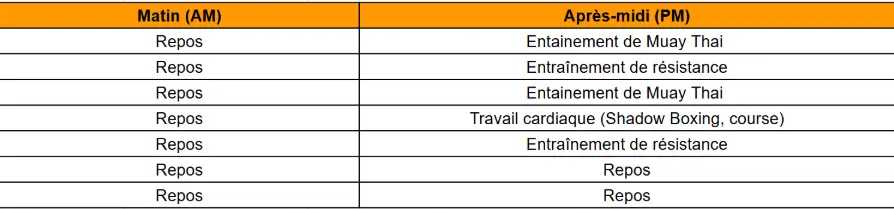 La vidéo ci-dessus montre comment tout s’assemble dans chaque semaine d’entraînement (exemple d’un combattant professionnel).